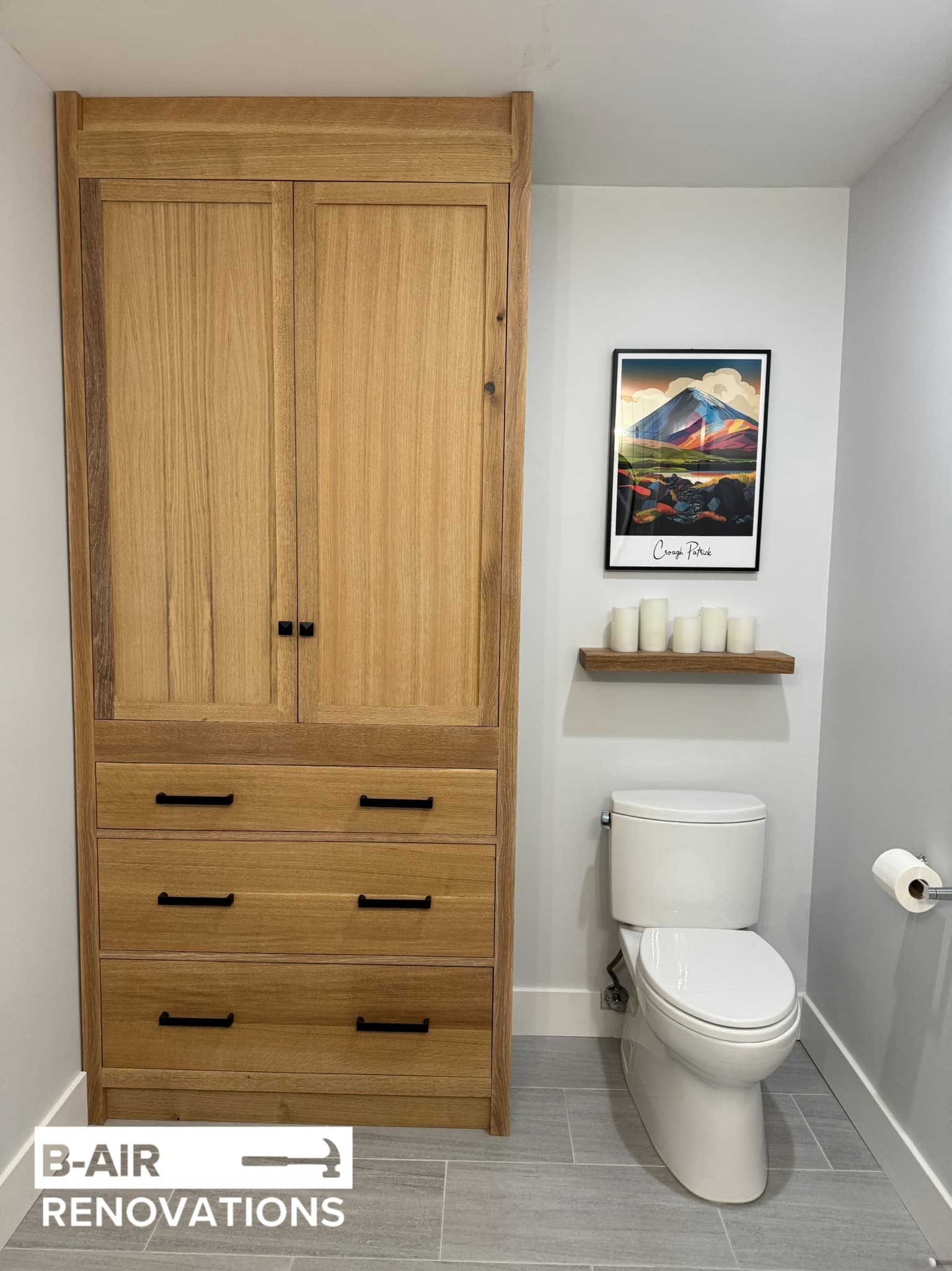 Natural wood floating vanity, cage pendant lights, matte black hardware.