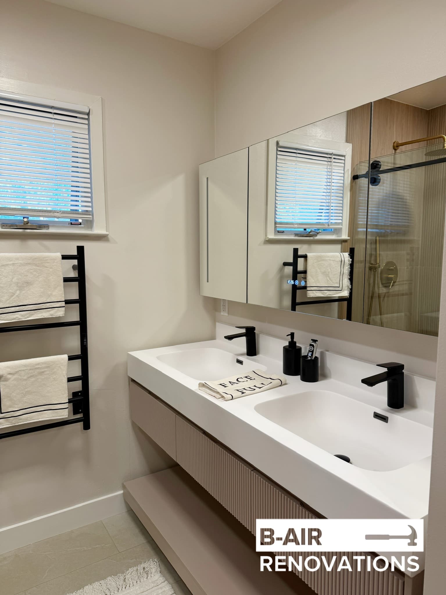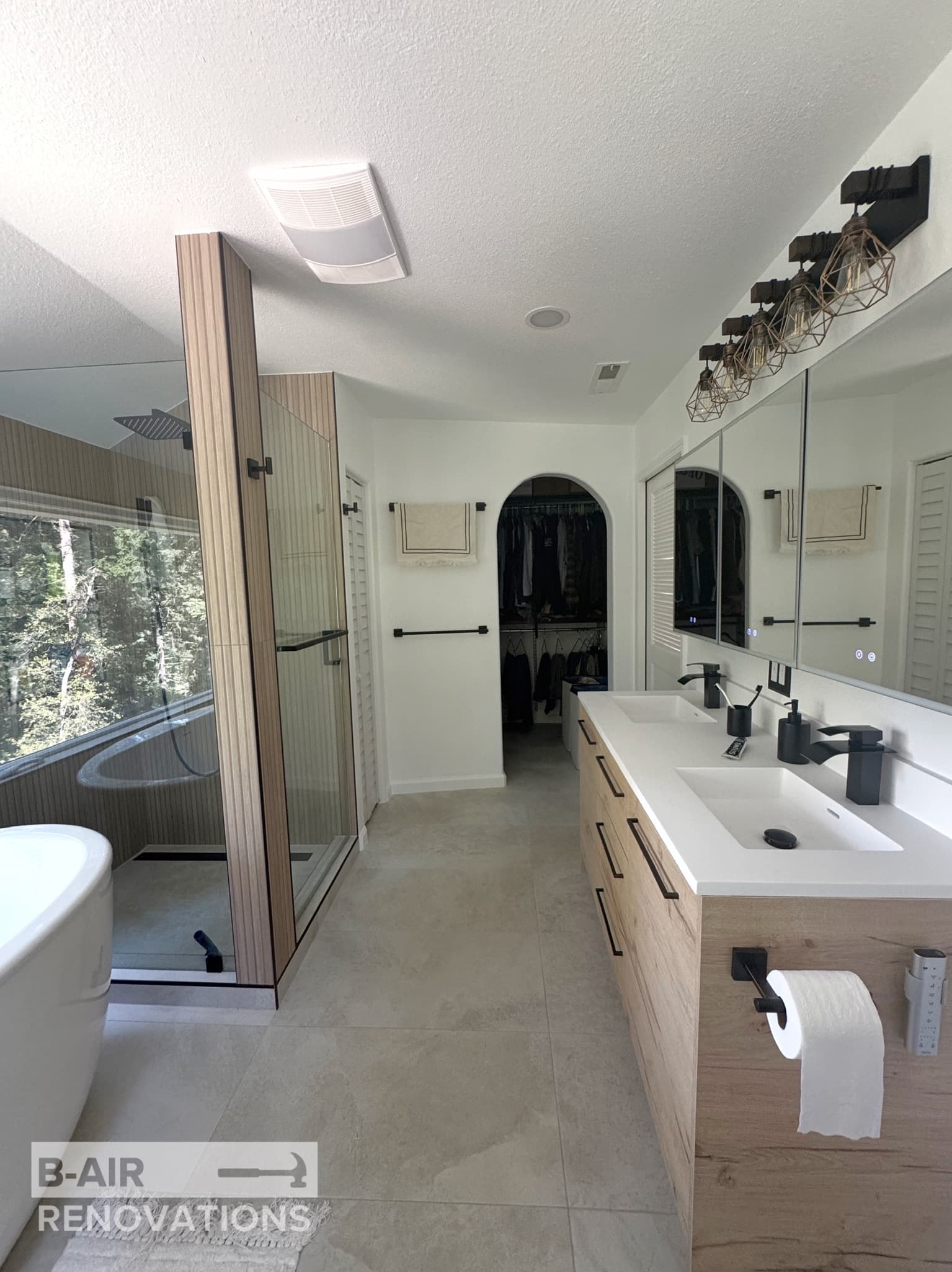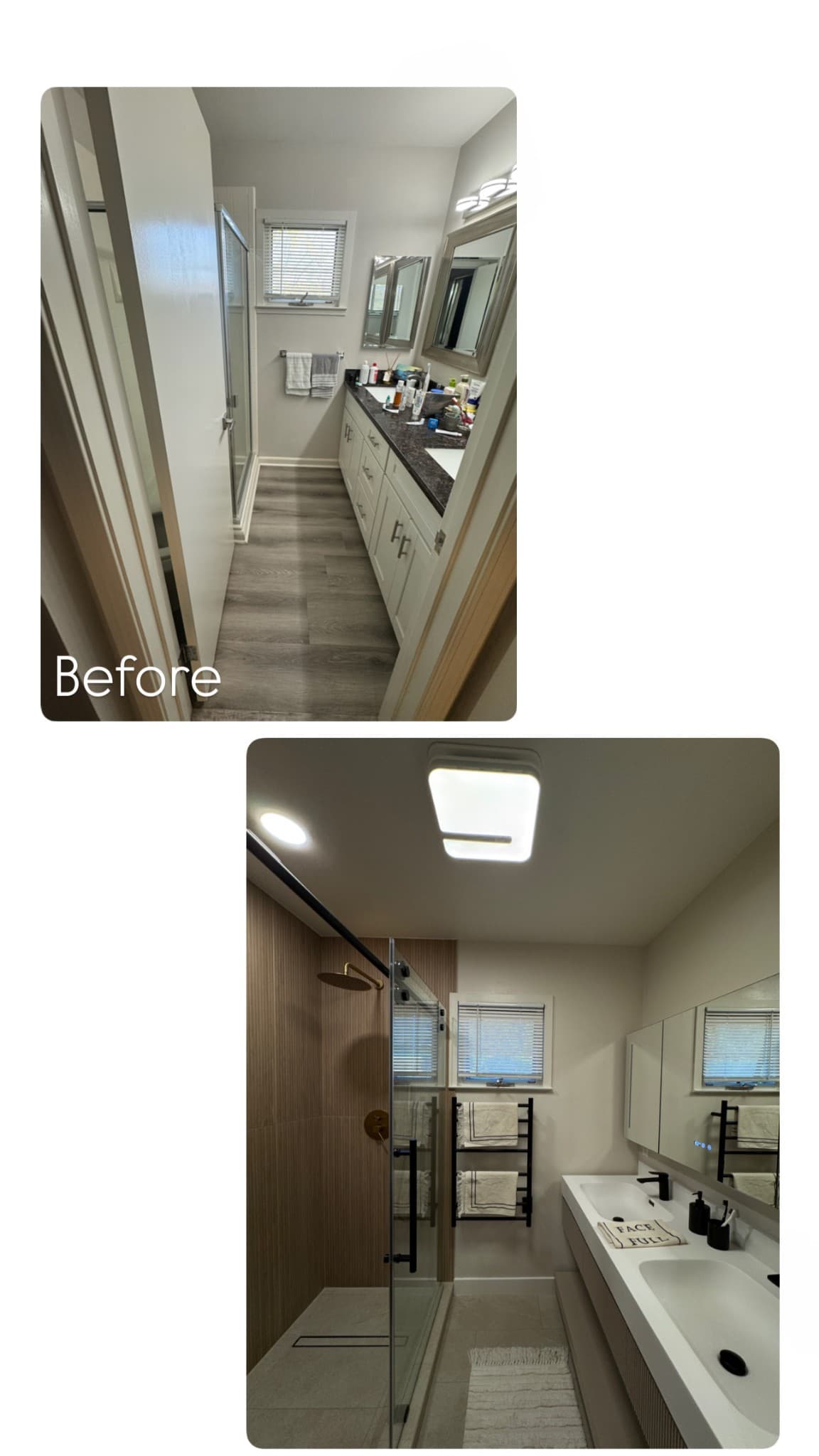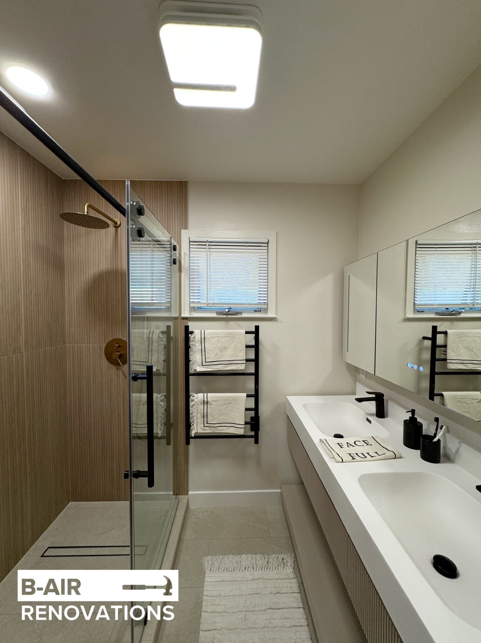 Floating double vanity, fluted tile shower, matte black fixtures.