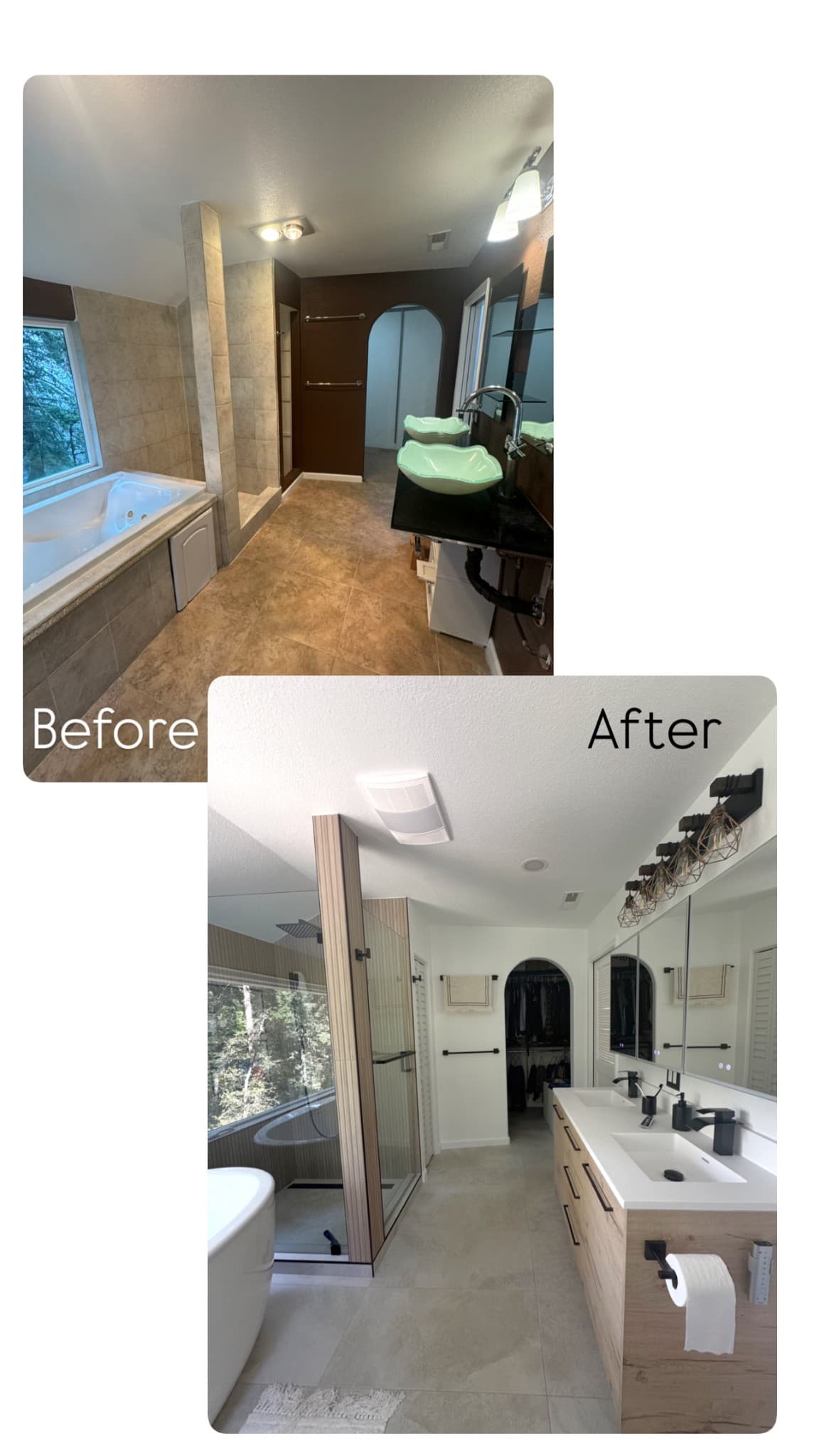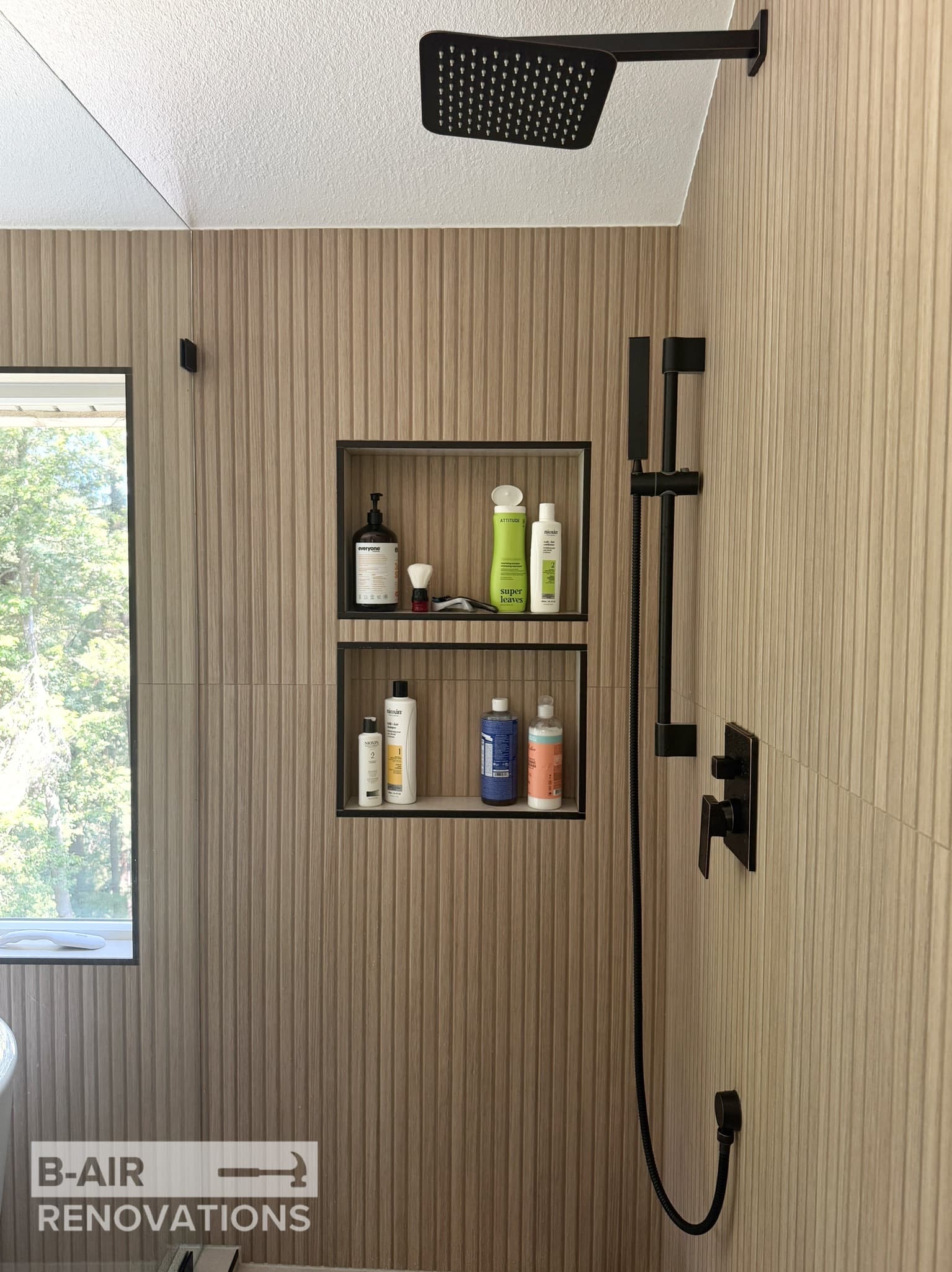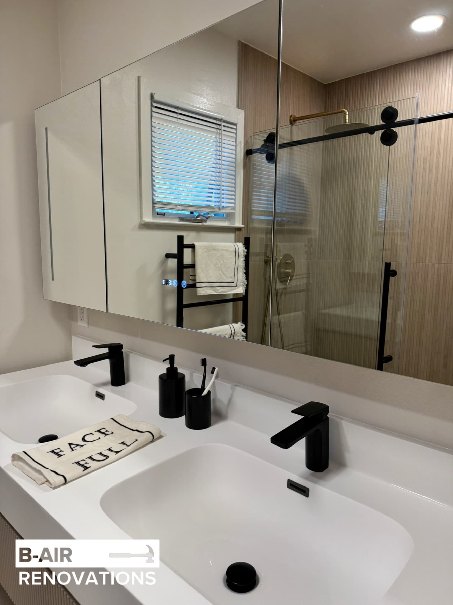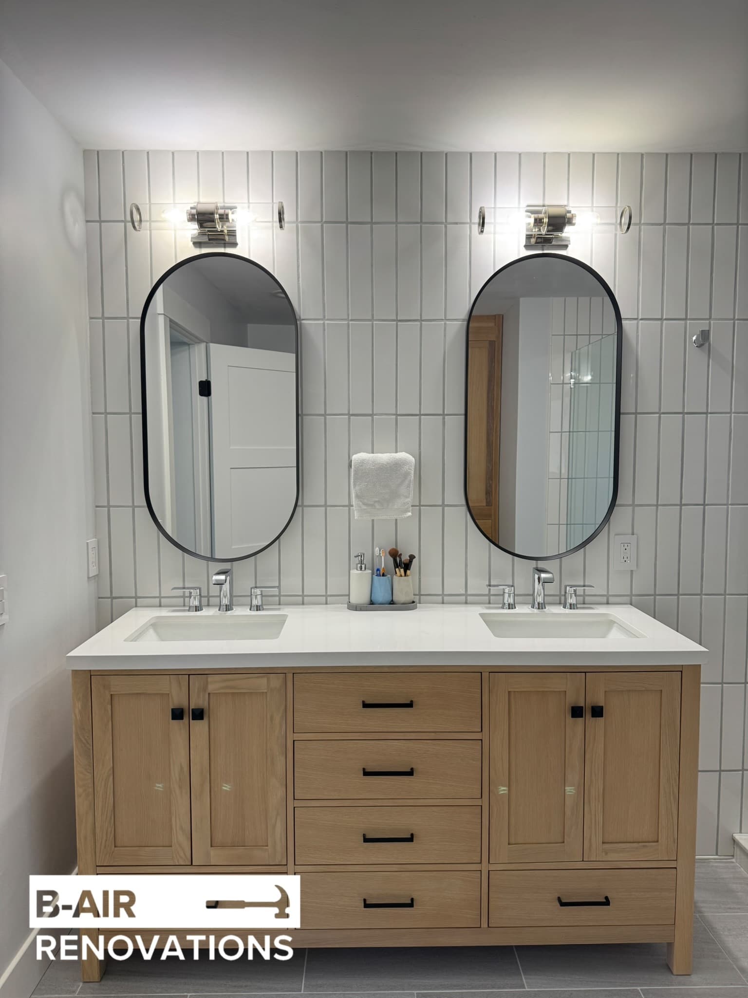 Floating double vanity, fluted tile shower, matte black fixtures.