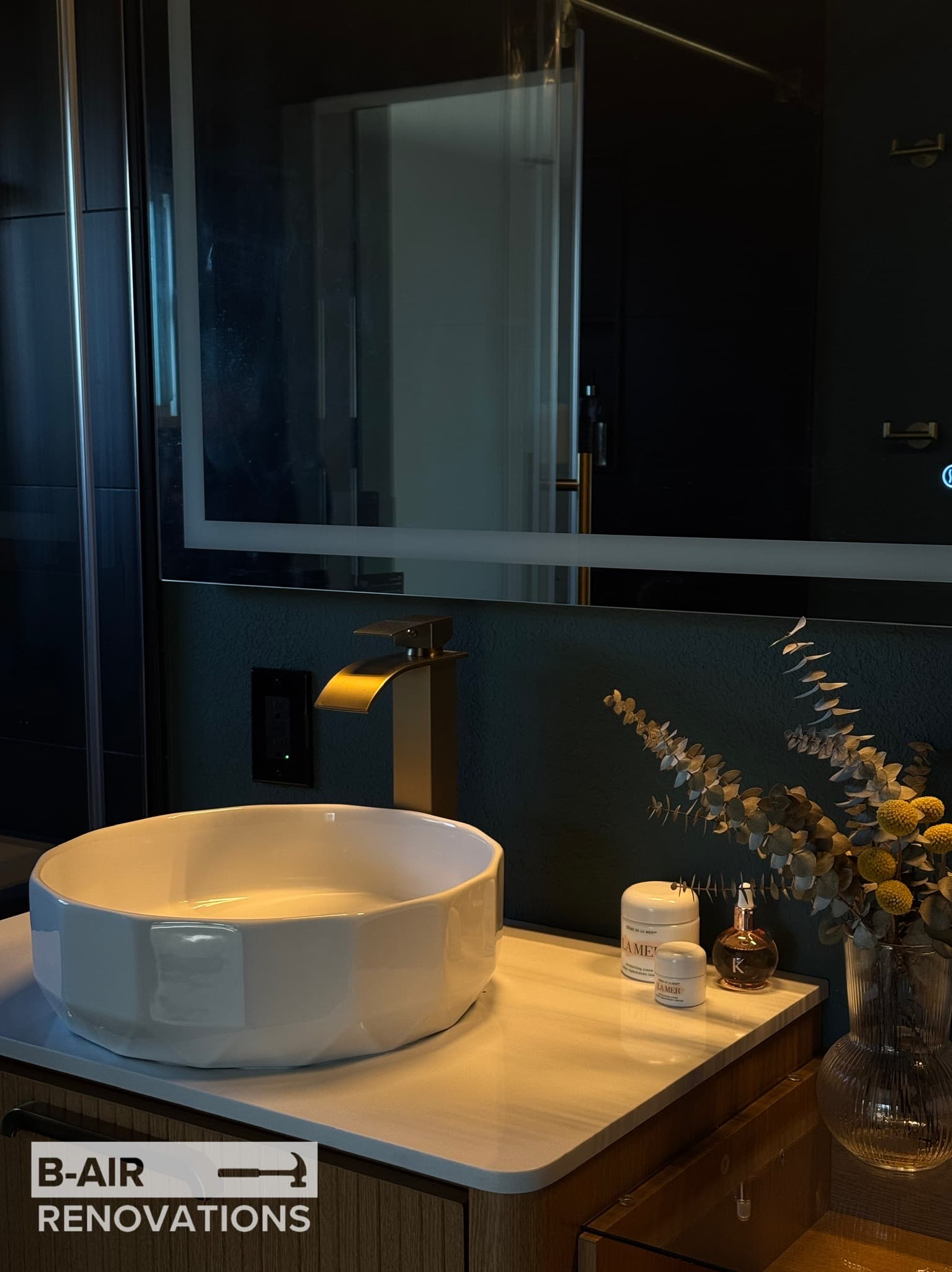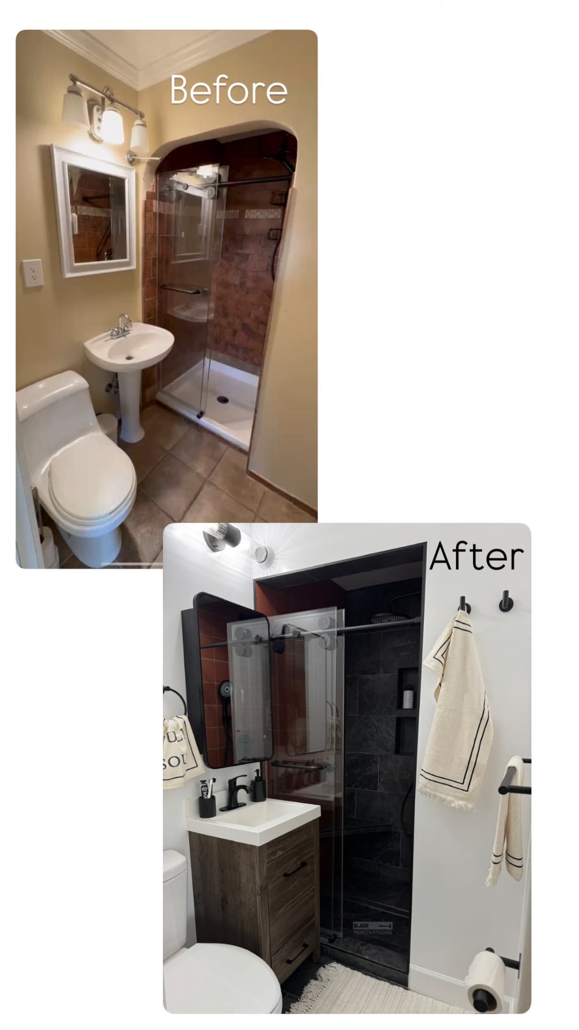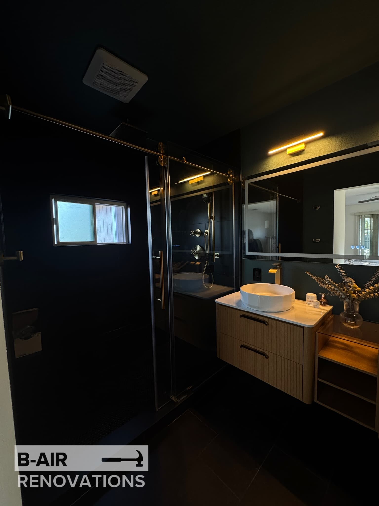 Dark tile, modern vanity, frameless glass shower enclosure.