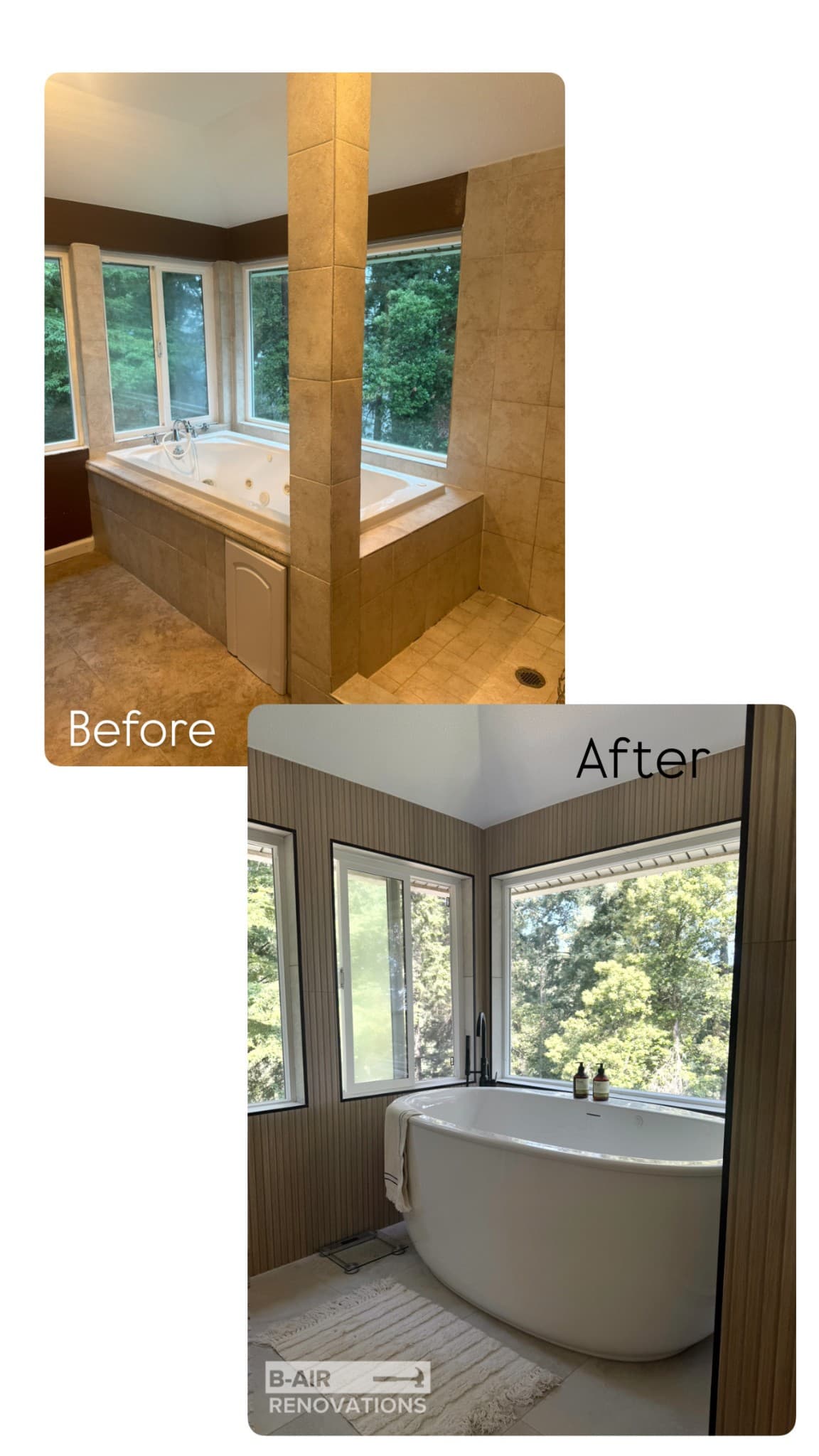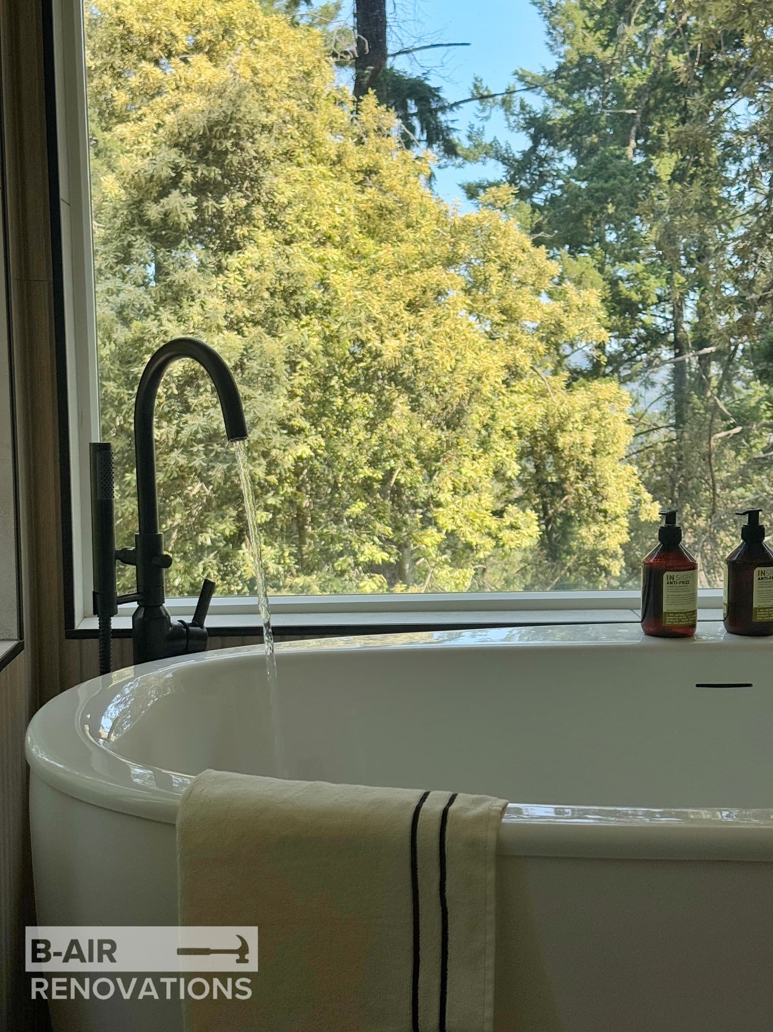 Freestanding tub, fluted tile shower, oak cabinetry, matte black fixtures.