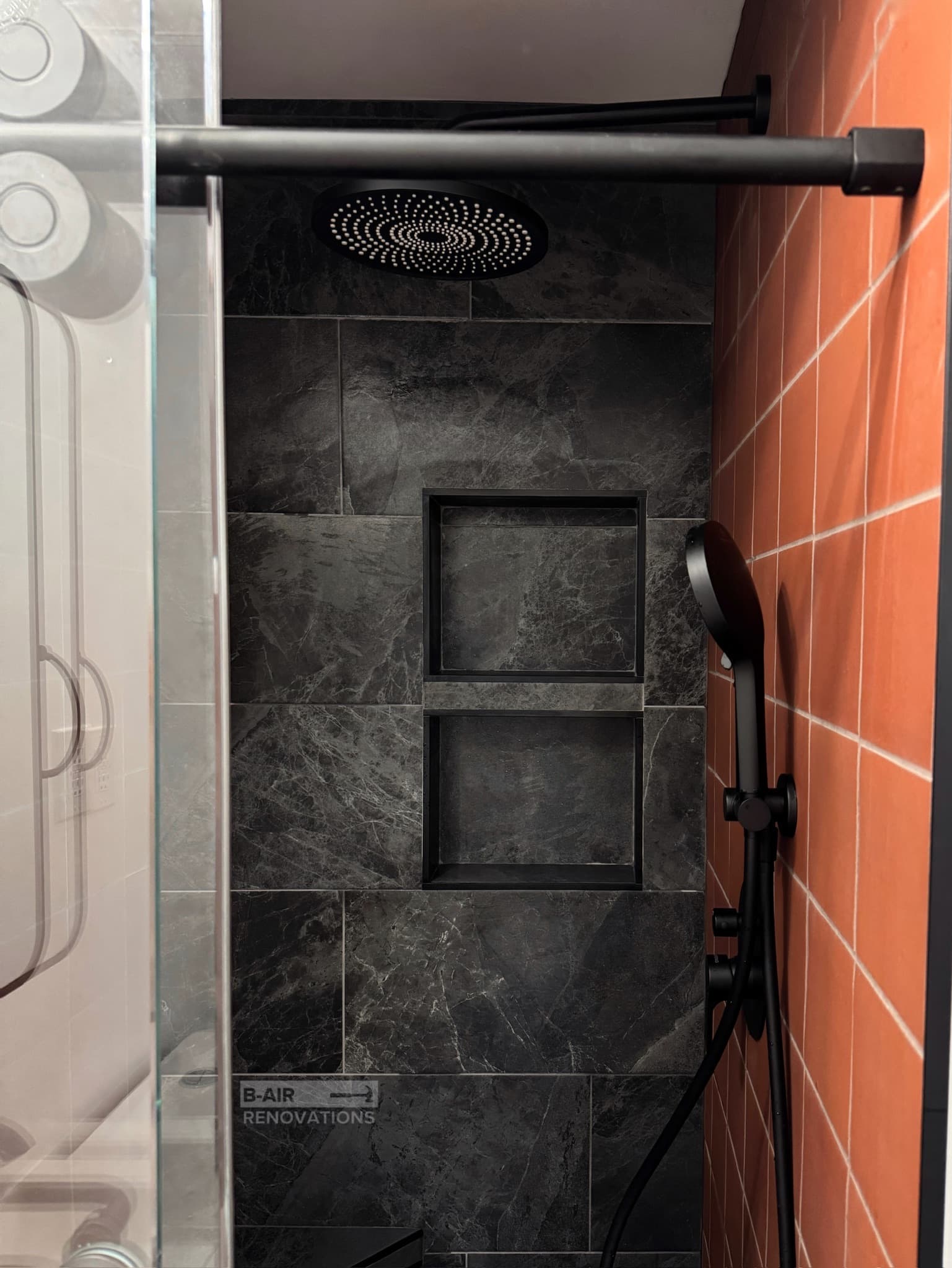 Dark marble shower, terracotta accents, wood-grain vanity, matte black fixtures.