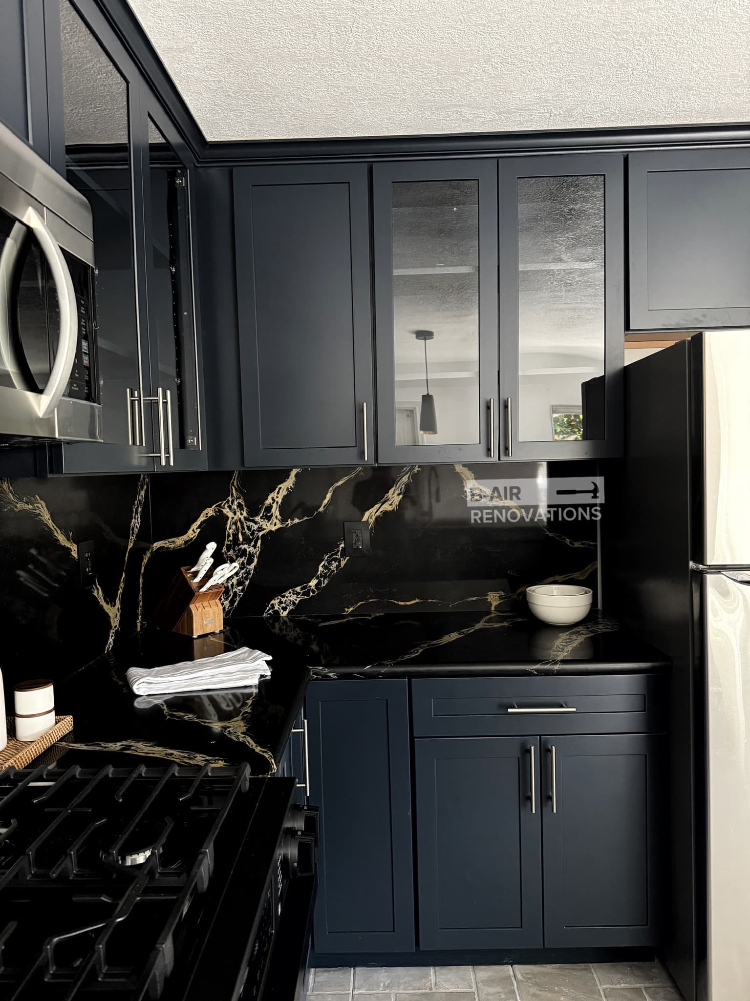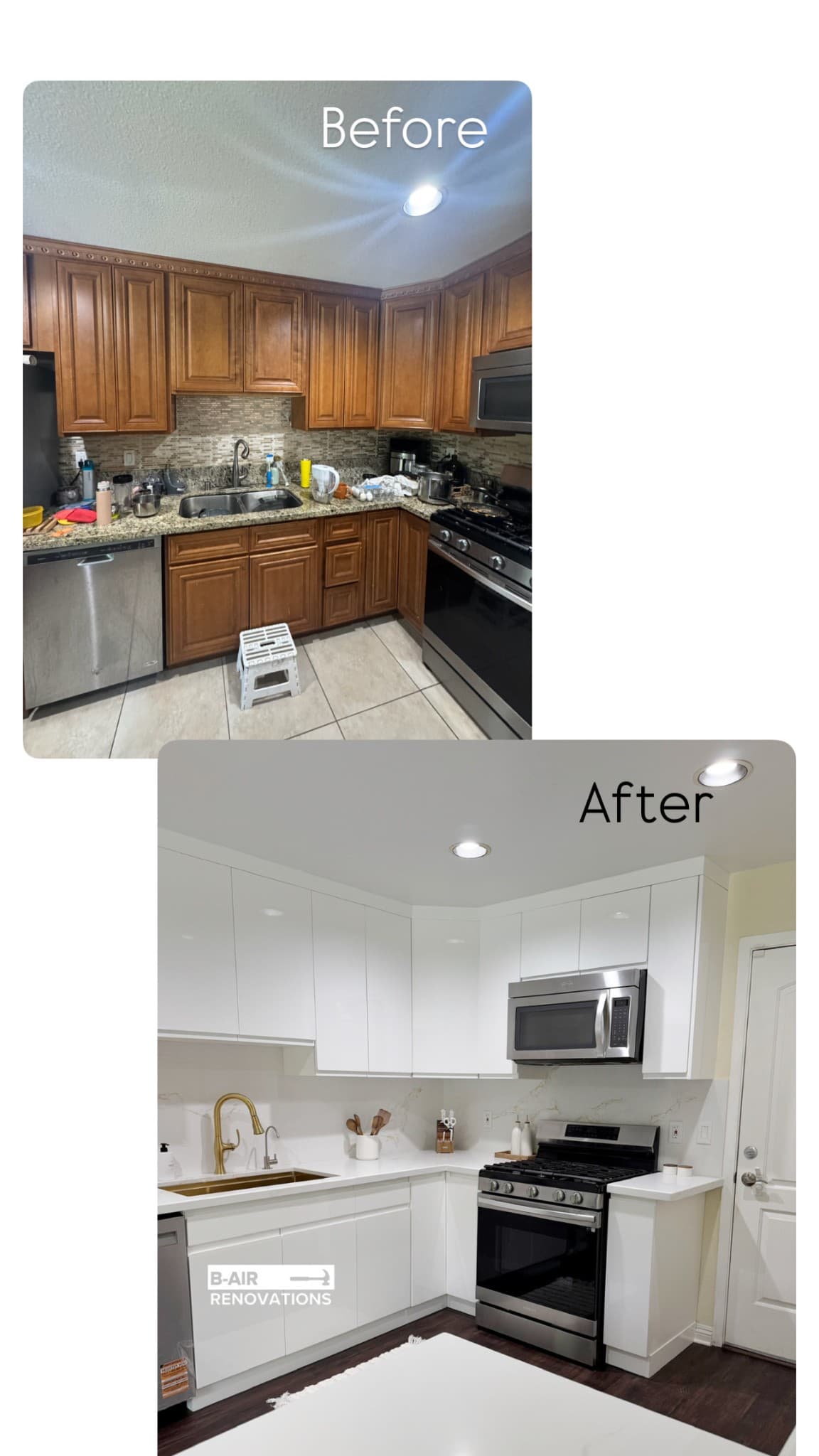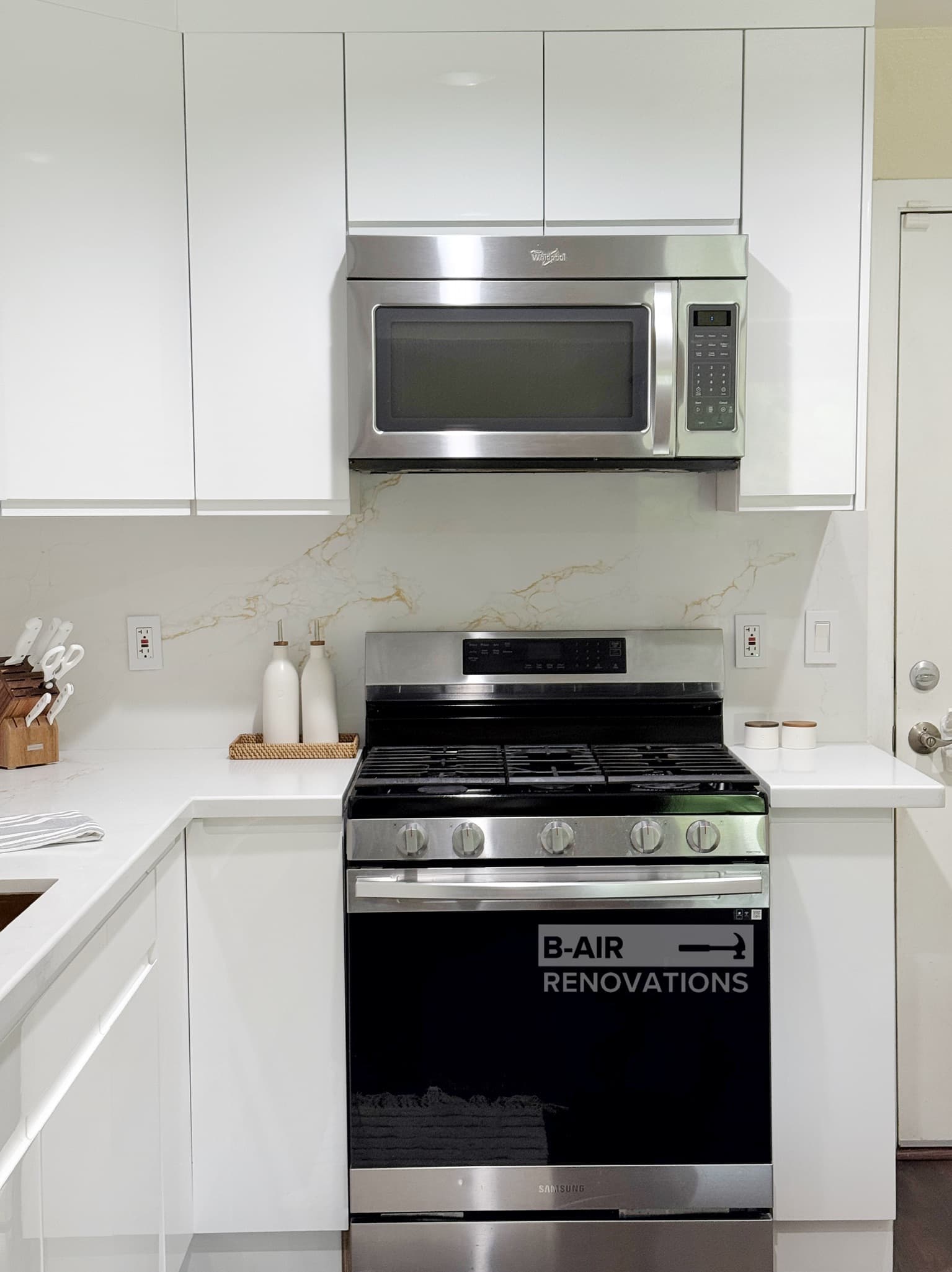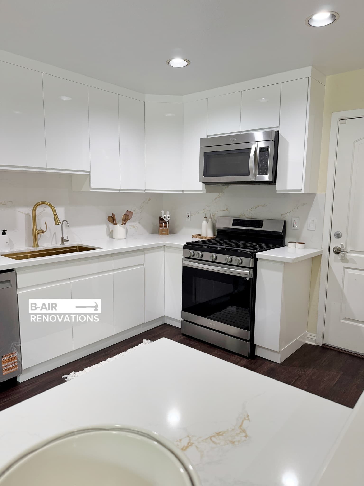 Flat-panel white cabinetry, quartz countertops, gold fixtures.