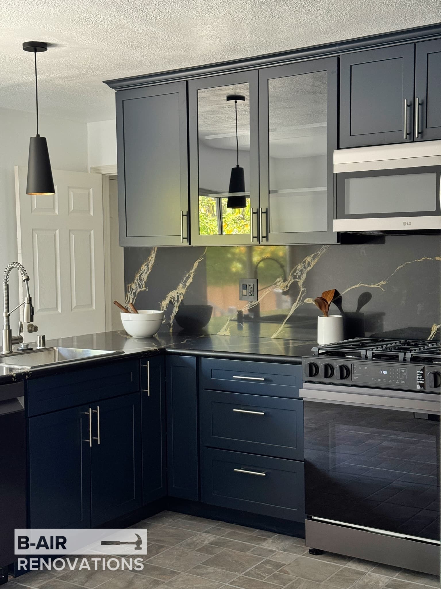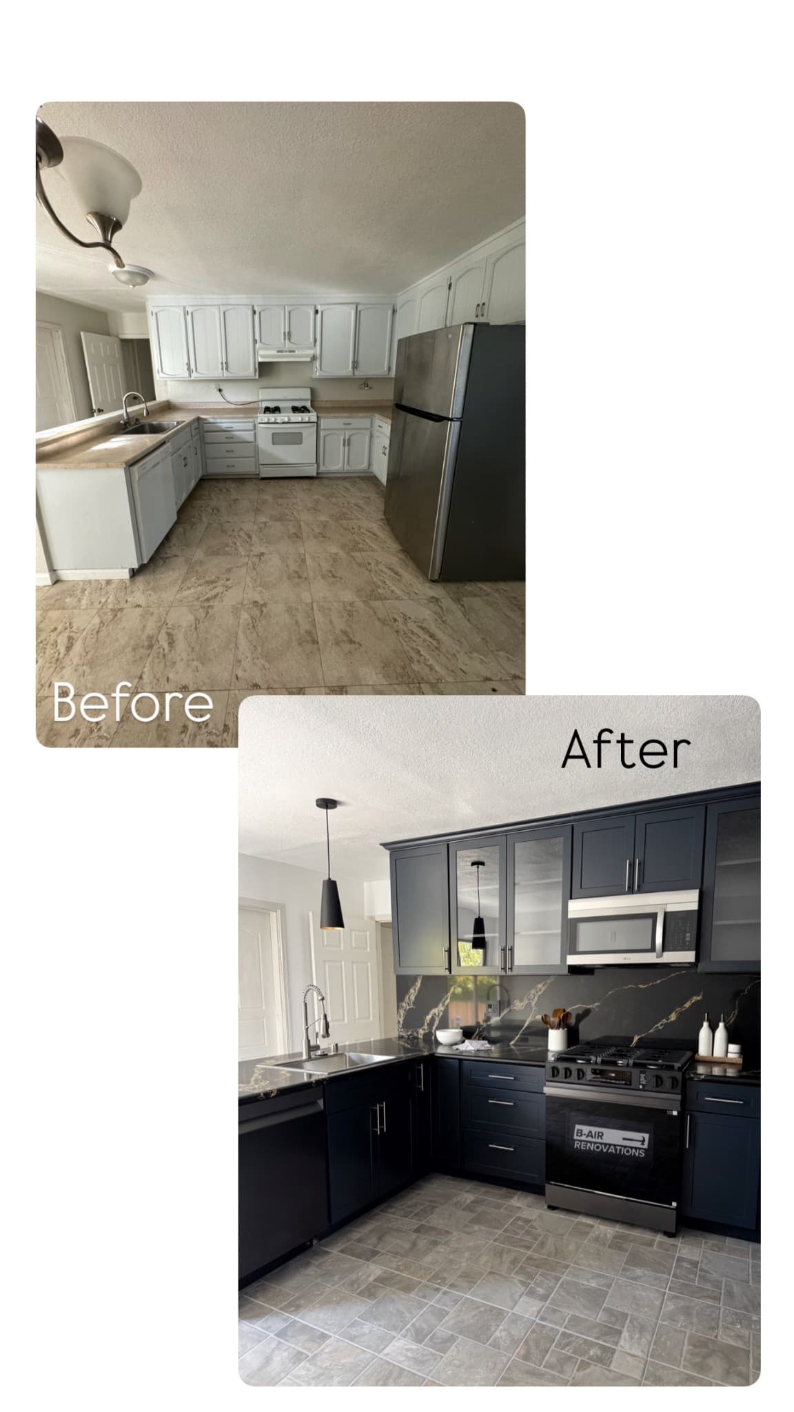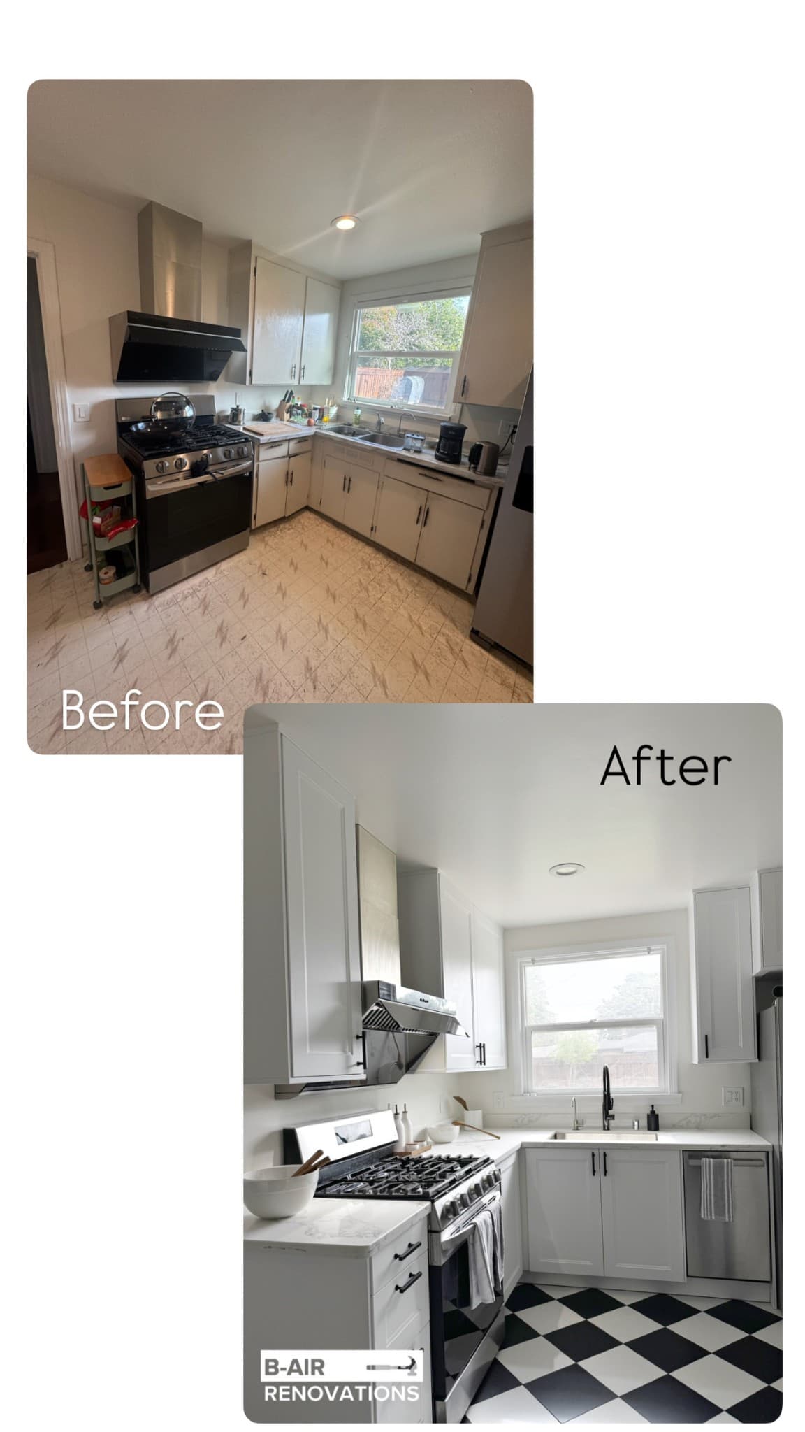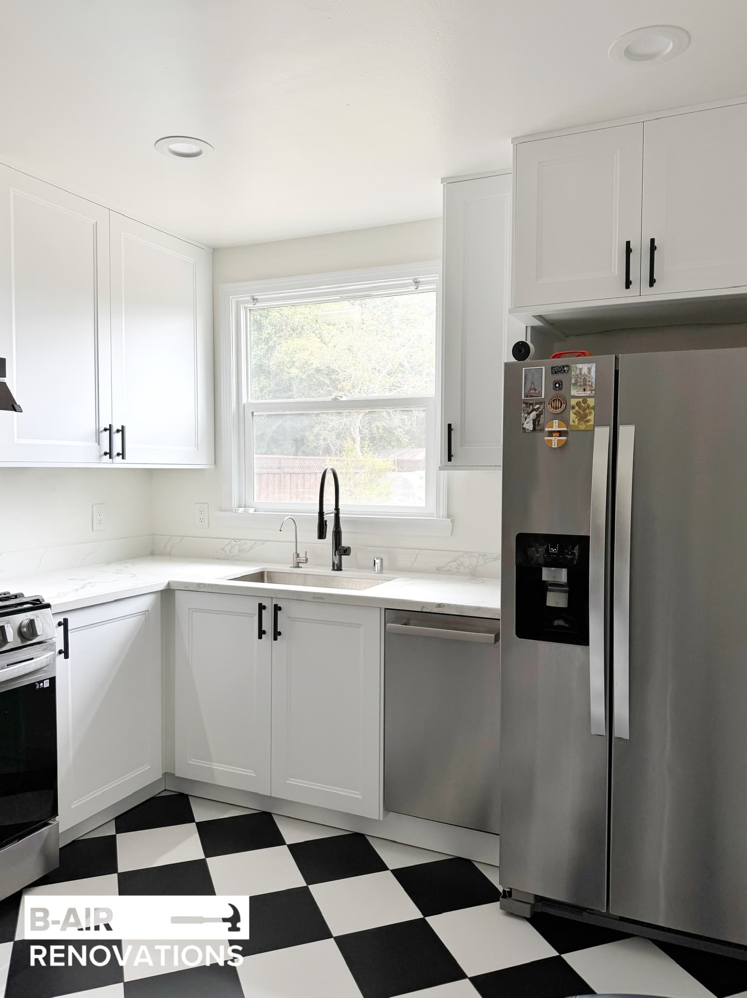 Gray shaker cabinets, marble-look countertops, checkered floor.