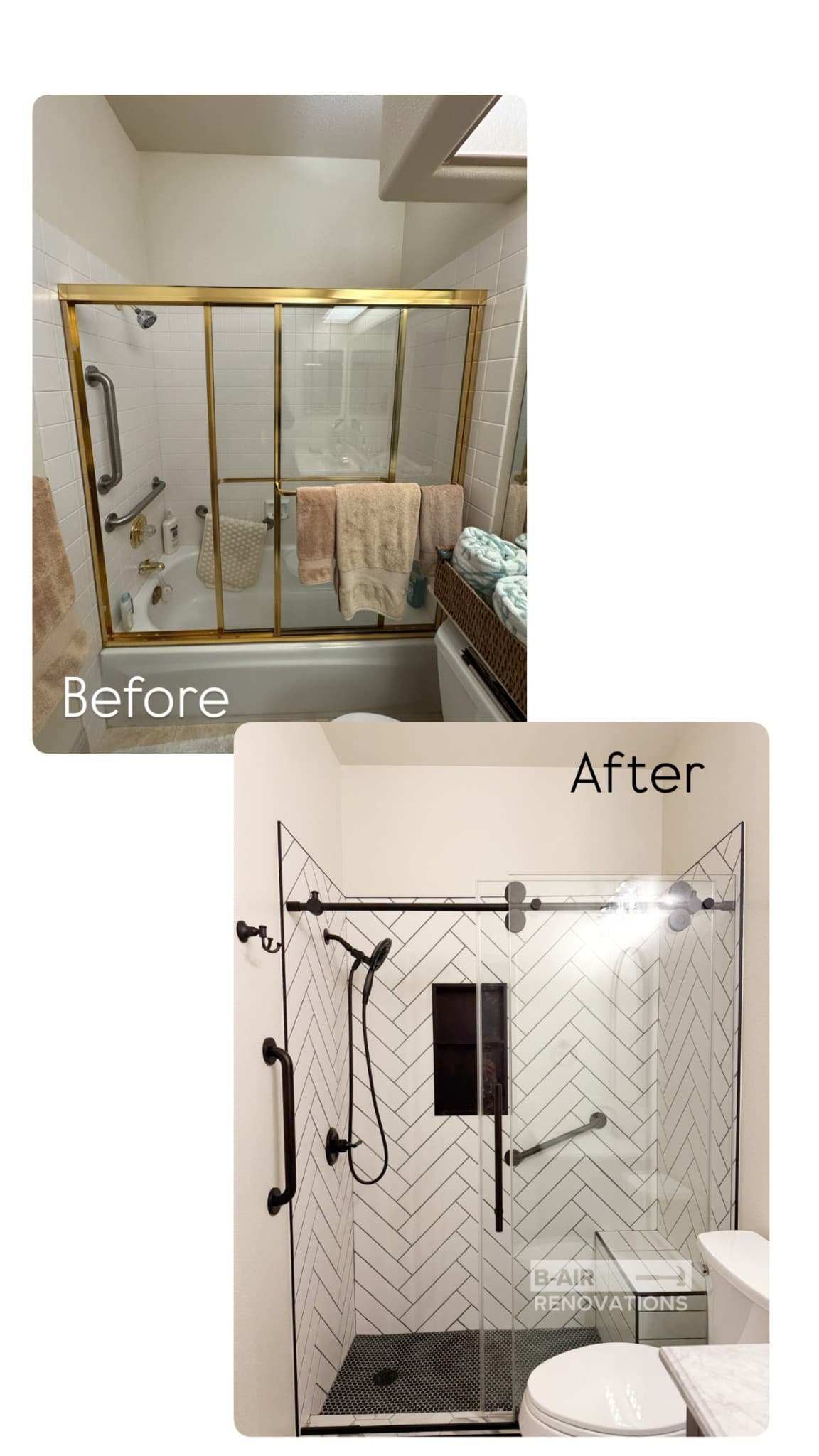 Herringbone tile, frameless glass enclosure, matte black fixtures.